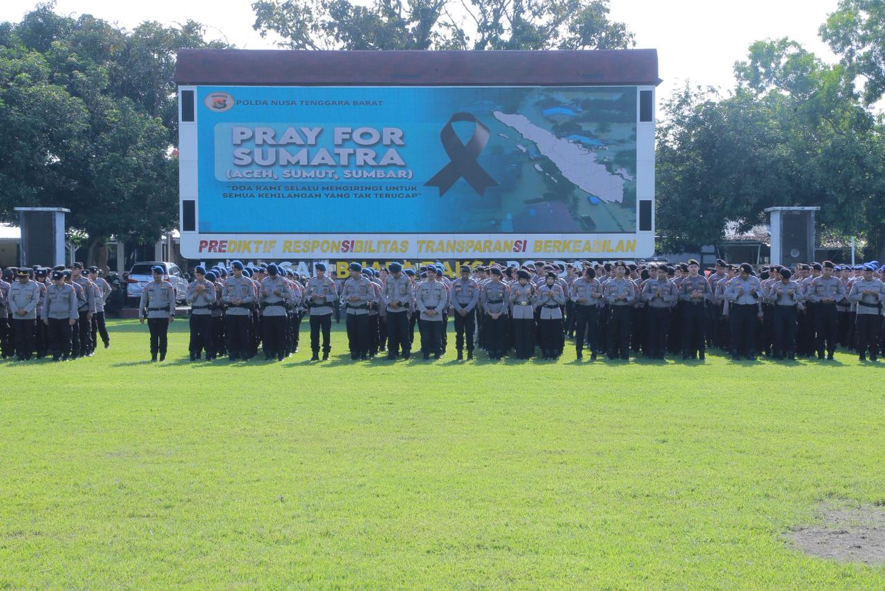 Mataram— Tribun Lapangan Bhara Daksa Polda NTB, Senin (8/12/2025) pagi, tampak lebih mengalirkan energi positif karena doa-doa khusyuk. Tepat pukul 08.00 Wita, jajaran Polda NTB menggelar Doa Bersama “Pray for Sumatera” yang dirangkai dengan syukuran Hari Ulang Tahun Bareskrim, Slog, dan Divkum Polri.